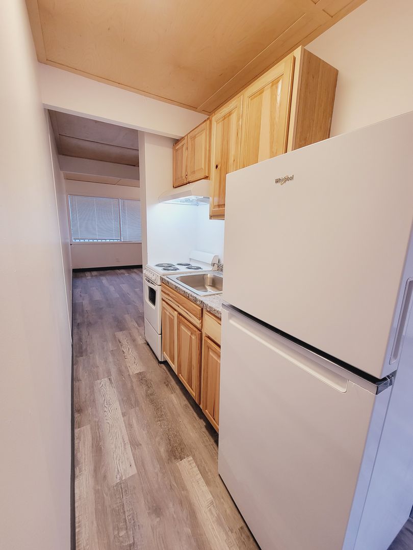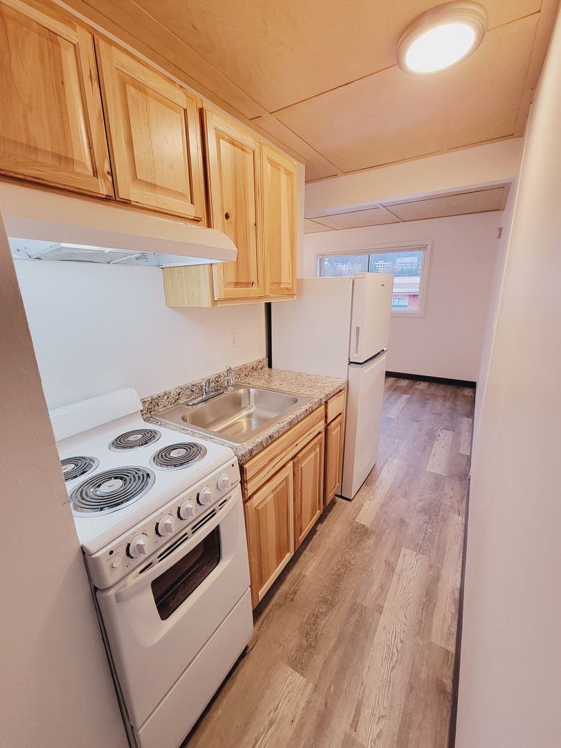 Top level unit with 1 bedroom, living room, kitchen, full bath. New hard surface laminate throughout the apartment, coin-op common laundry on site, view of the channel and in walking distance of the grocery store, bus transport, post office, downtown restaurants, shops and Juneau business district. Rent includes water/sewer, garbage and snow removal. Tenant is responsible for cable and electric. No Pets, No Smoking and security deposit applicable. STREET PARKING ONLY.