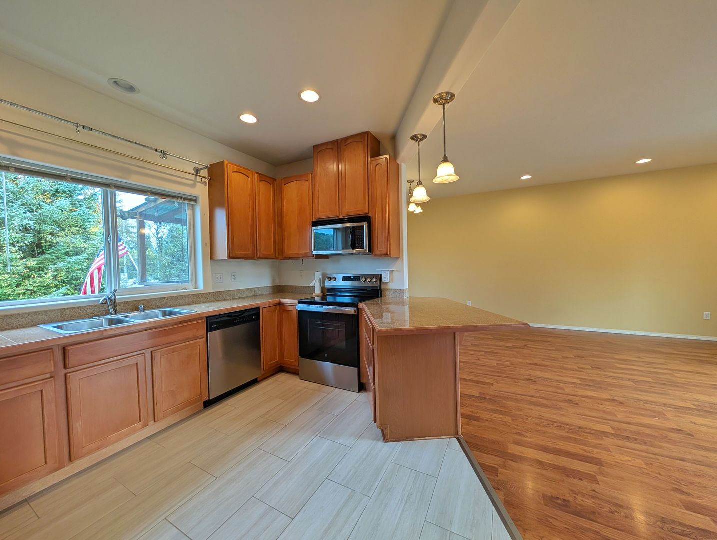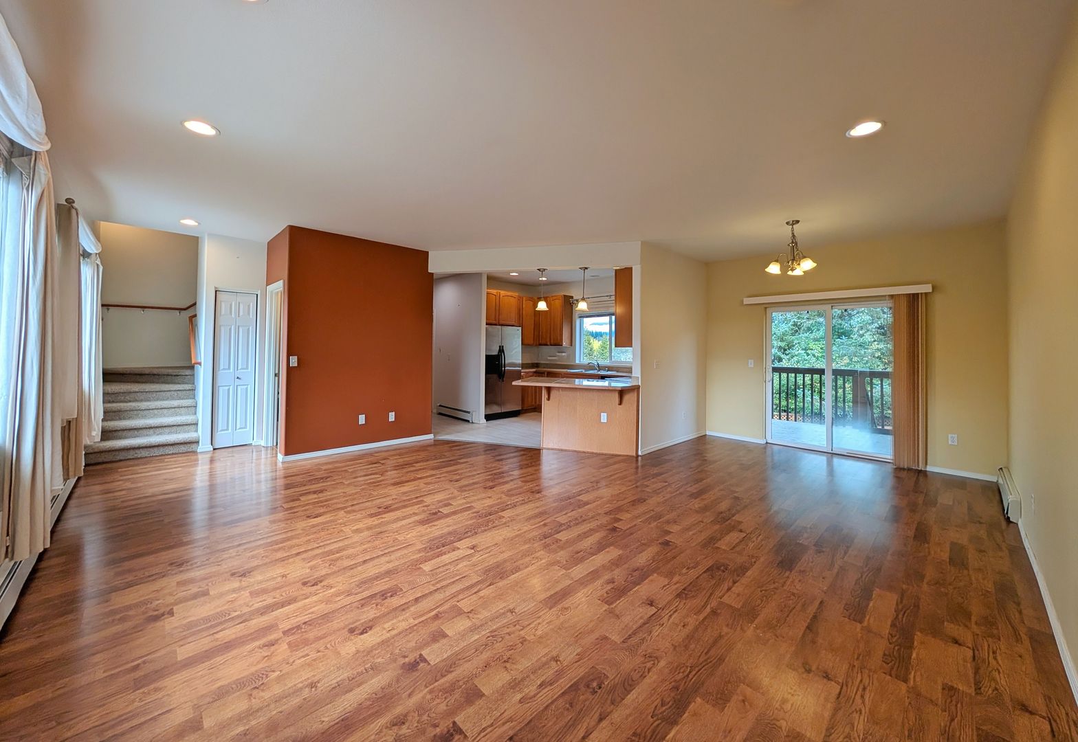 - Versatile open-concept second floor with a large kitchen, combined living and dining area, and a convenient half bath